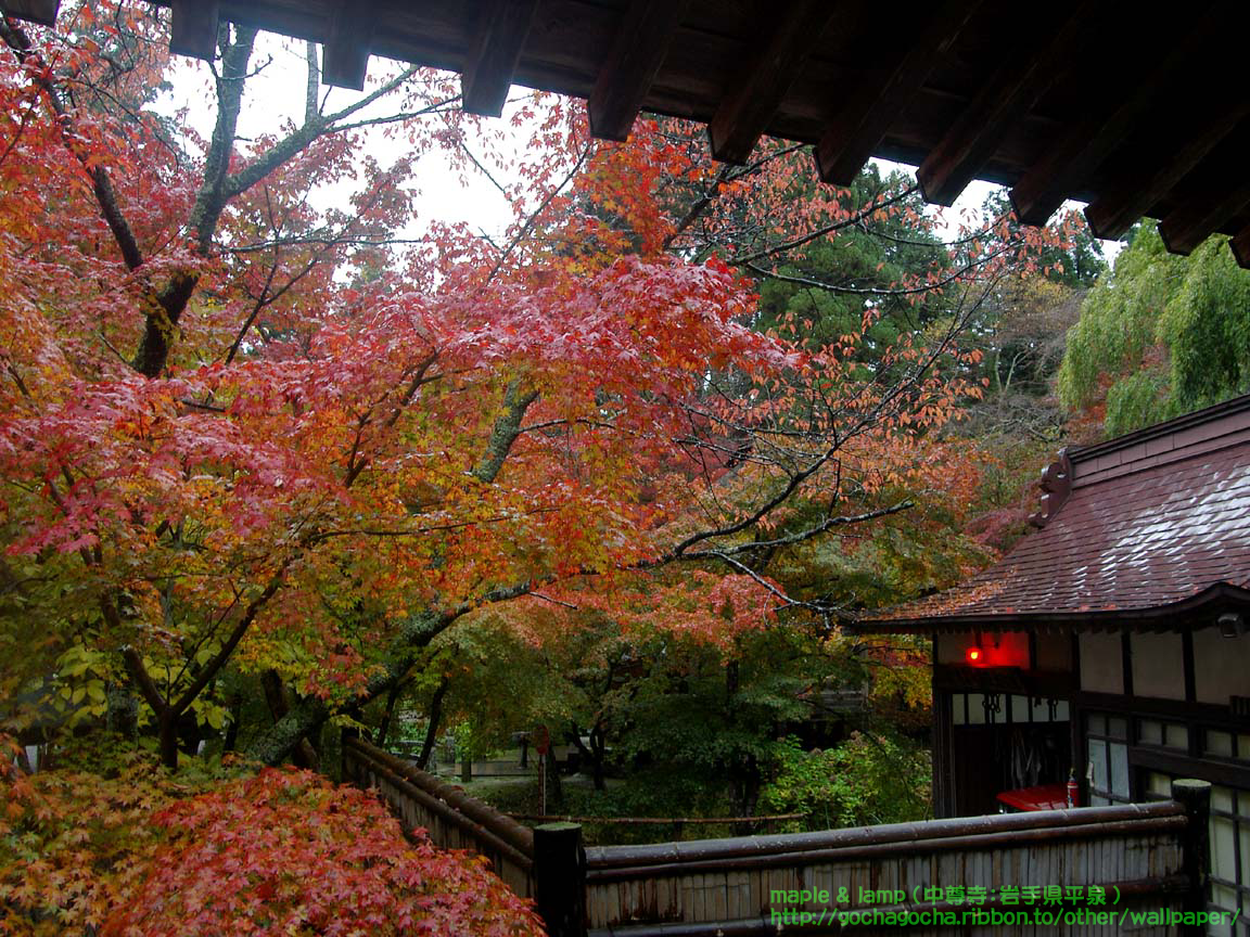 もみじとランプ、なんとなくいい感じだと思います 撮影場所:岩手県平泉、日本 中尊寺本堂廊下(国宝) 撮影場所:岩手県平泉、日本
